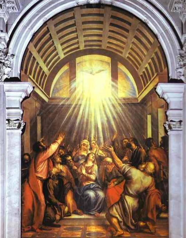 “Mentre stava compiendosi il giorno della Pentecoste, si trovavano tutti insieme nello stesso luogo. Venne all’improvviso dal cielo un fragore, quasi un vento che si abbatte impetuoso, e riempì tutta la casa dove stavano. Apparvero loro lingue come di fuoco, che si dividevano, e si posarono su ciascuno di loro, e tutti furono colmati di Spirito Santo e cominciarono a parlare in altre lingue, nel modo in cui lo Spirito dava loro il potere di esprimersi”. – dagli Atti degli Apostoli.