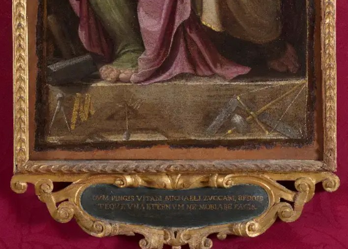 Sulla cornice in basso è riportata l’iscrizione in latino DVM PINGIS VITAM MICHAELI ZVCCARE REDDIS/ TEQVE VNA ETERNVM NE MORIARE FACIS.