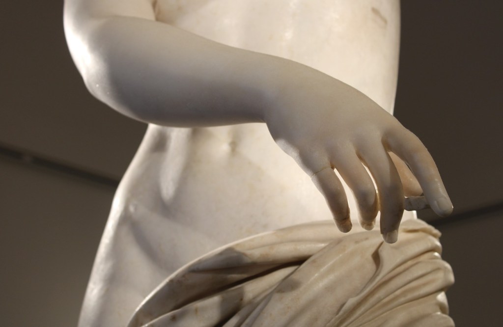 I would like to point out a detail. Look at the hands of the goddess: they still have the bridges left by the restorer. The so-called “bridges” are those small marble connections that Brunelli left between the fingers to provide structural support during the work.
