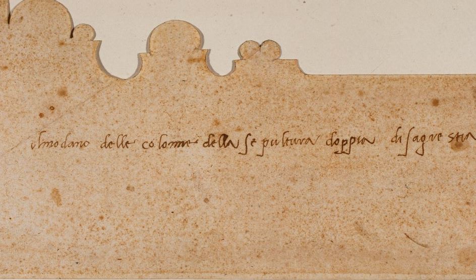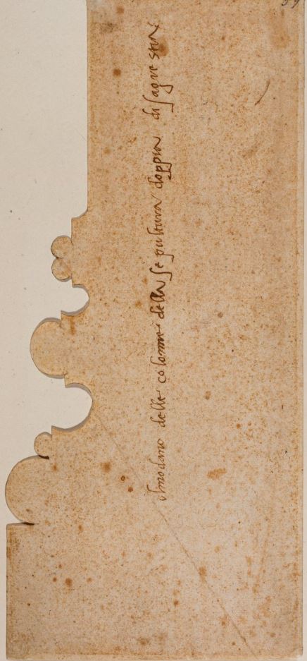 Tecnicamente questo foglio si chiama mondano, termine usato per indicare il profilo a grandezza naturale di un elemento architettonico che poi viene adoperato come guida dagli scalpellini.