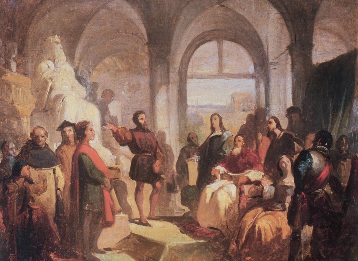 A private Florentine collection houses the painting entitled ‘Michelangelo presents Moses to the great men of his time’, painted in oil on canvas by Annibale Gatti between 1853 and 1855.