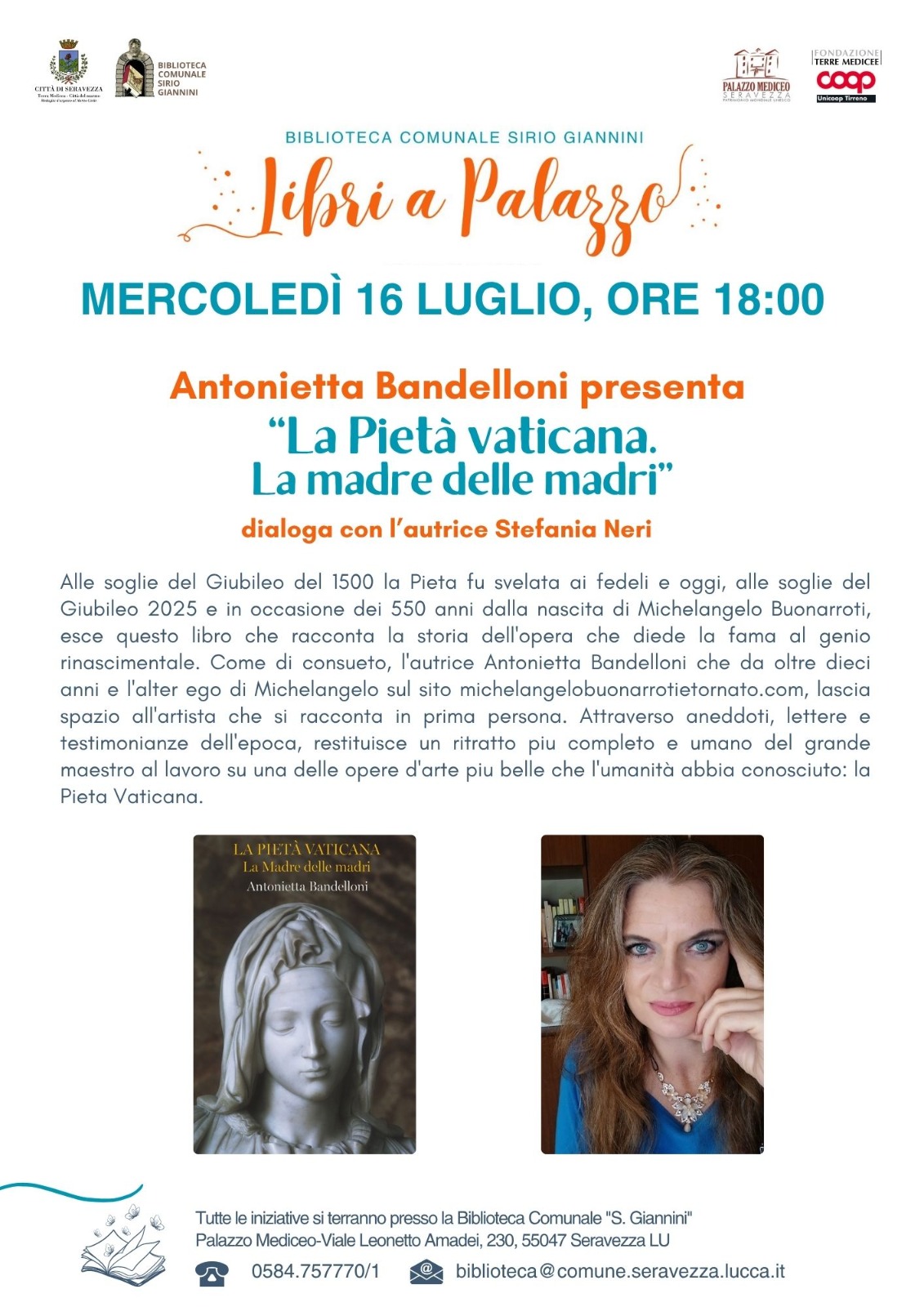 Vi aspetto mercoledì 16 luglio alle ore 18 al Palazzo Mediceo di Seravezza per raccontarvi del mio ultimo libro ‘La Pietà Vaticana. La Madre delle madri’.