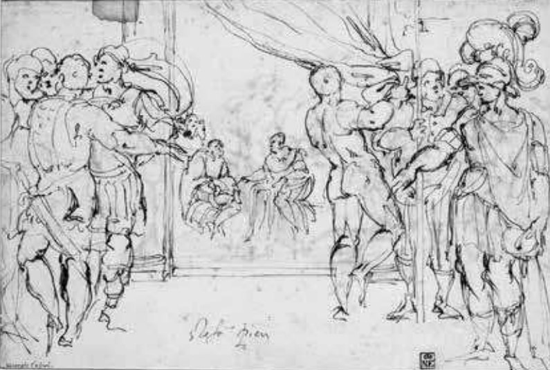 That sketch is the study for one of the paintings that later decorated the funeral apparatus that the Florentine Academy of Arts and Design put together for my solemn funeral, celebrated five months after my departure from your world, on July 14, 1564.