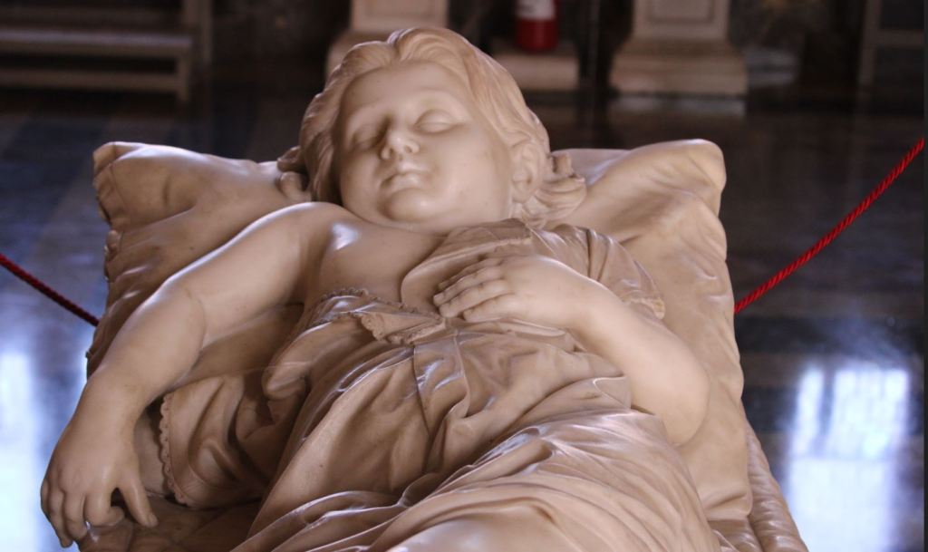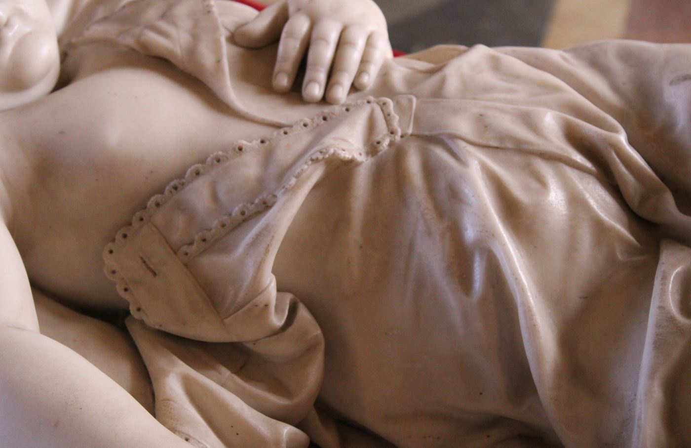 Basta osservare come si appoggiano sul cuscino i suoi capelli, la trama del tessuto damascato sotto il capo, le pieghe della veste e il suo pizzo ma anche la morbidezza con la quale l’artista riesce a scolpire le manine con quell’atteggiamento tipico dei bambini di quell’età.