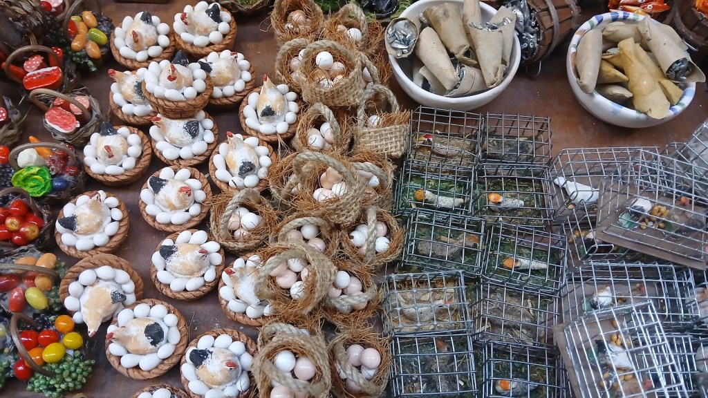 Mentre mi muovo da una bottega all’altra, con i banconi che espongono le ceste di uova e le galline in miniatura fronte via, mi perdo tra quei colori e le loro simbologie che mi fanno pensare a opere in cui niente è stato dipinto lì a caso.