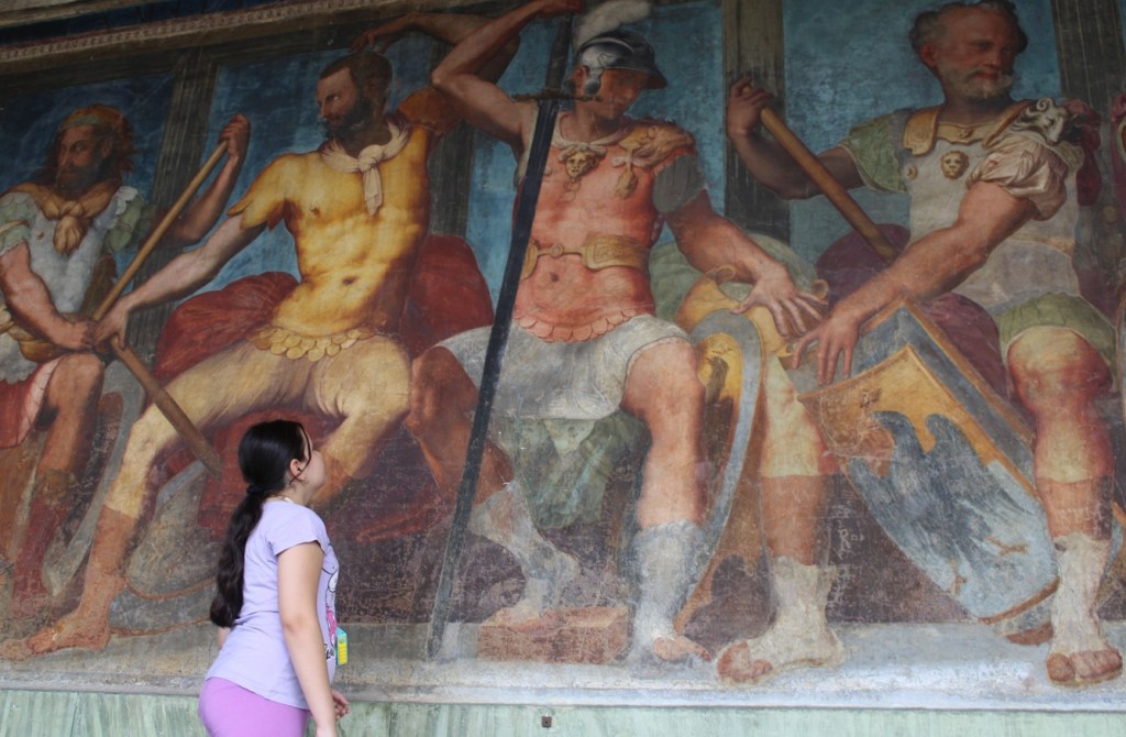 The walls depict twelve warriors, all recognizable as members of the Doria family by their shields bearing the black eagle on a gold and silver field. They are identified by an inscription that reads: “PRAECLARAE FAMILIAE MAGNI VIRI MAXIMI DUCES OPTIMA FECERE PRO PATRIA,” or “The great men of the illustrious family, supreme leaders, did excellent things for their country.”