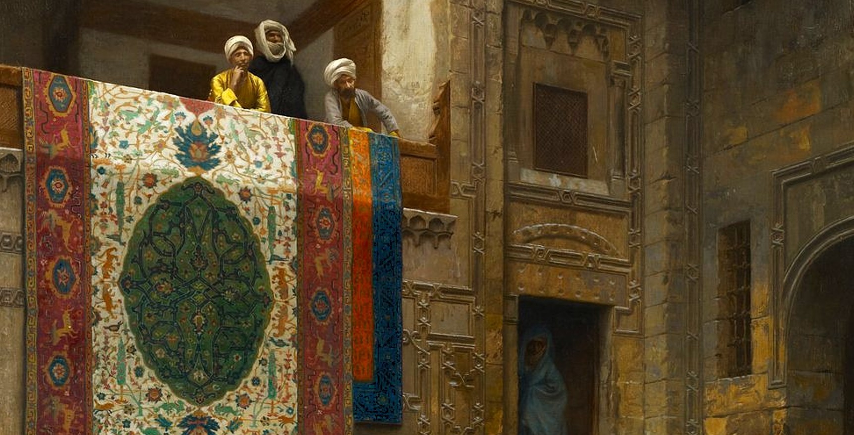 Viewers of the work find themselves immersed in the typical atmosphere of Cairo at the time, one of the most active centers for the carpet trade. Several wealthy men, dressed in meticulously detailed robes, move across the scene.