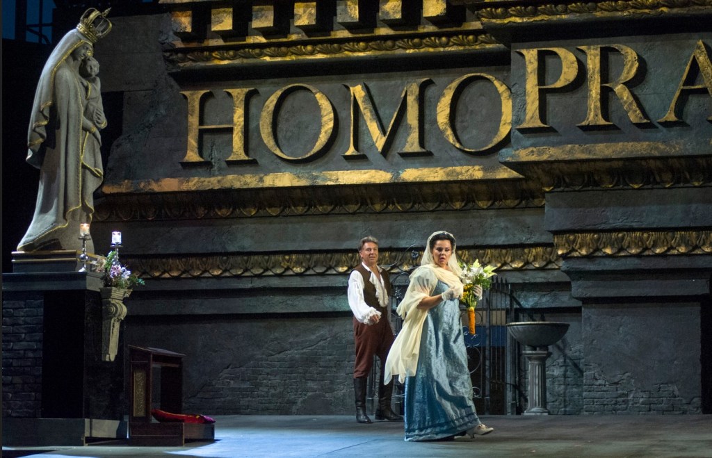 The lights go out in the theater overlooking the lake, silence falls, and we find ourselves in June 1800, inside the church of Sant’Andrea della Valle in Rome. The stunning setting transports us directly to the great papal basilicas of Rome and briefly distracts us from Angelotti’s arrival.