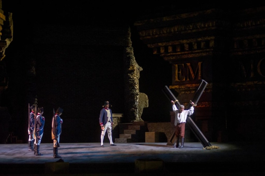 Hearing her lover’s screams, Tosca relents and reveals that he has hidden in a well in the garden of Cavaradossi’s villa. Scarpia, played by an intense and cruel Mikolaj Zalasinki, sentences the painter to death but offers Tosca the chance to save him: Mario’s life for her graces.