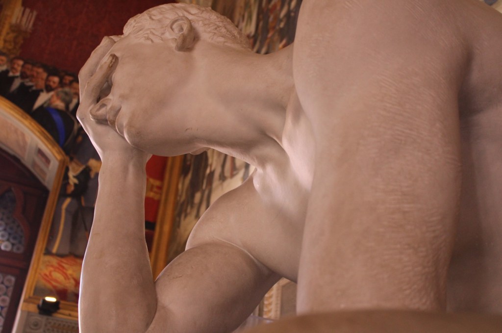 Looking closely at the sculpture, one can still clearly see the marks of the chisel and the cutting tool the artist used to shape that body overcome by who knows what pain.