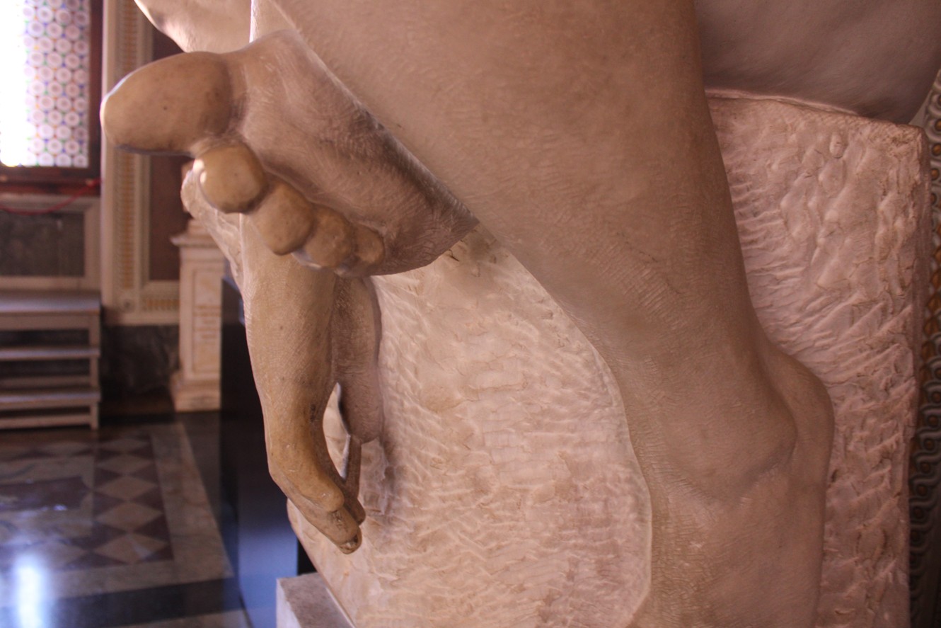 Osservando da vicino la scultura si leggono ancora nettamente i segni di subbia e di scalpello da taglio che l’artista adoperò per modellare quel corpo vinto da chissà quale dolore.
