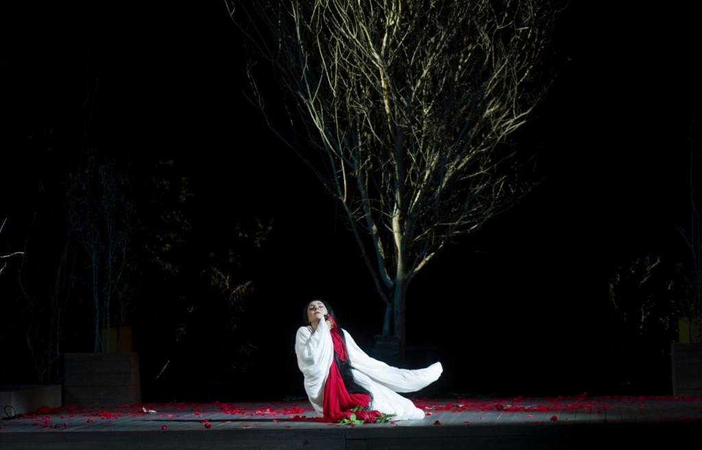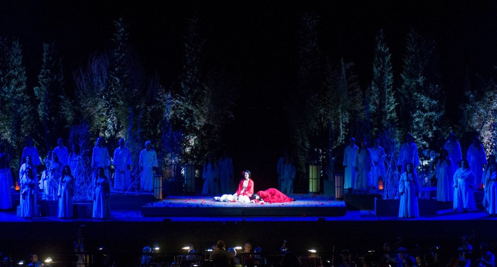 The audience takes its seats in the stalls and on the steps of the Gran Teatro Puccini, overlooking the lake. Manu Lalli’s minimalist, plant-filled staging soon comes to life with surprising lighting effects. But as darkness falls and Butterfly’s aunts and cousins, dressed in red, have already appeared, the two side screens bring us back to reality like a stab in the chest: “Let’s Stay Human – Save Gaza.”