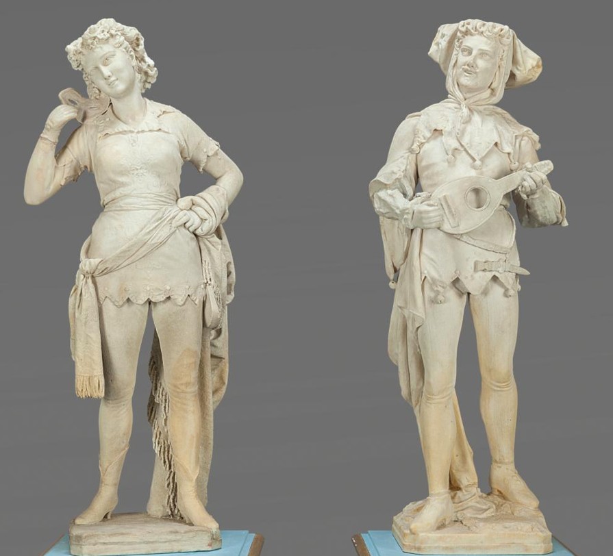 Among Costantino Pandiani’s most famous works are the marble bust of a young woman and the pair of marble sculptures titled Minstrel and Devil, also known as the “mask.”