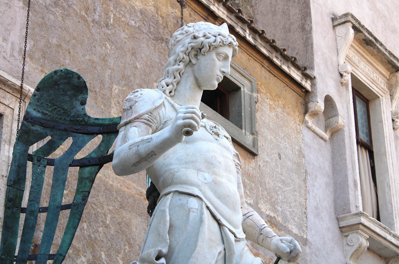 The sculpture that dominates the courtyard depicts Saint Michael the Archangel, as can be deduced from its iconographic attributes. It was created by Montelupo in 1544 and initially placed above Castel Sant’Angelo.