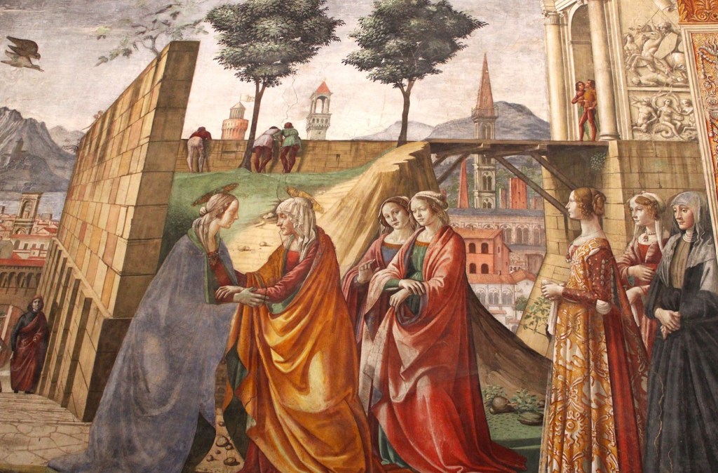 Su esplicita richiesta del Tornabuoni, il Ghirlandaio, con una ricercatezza dei dettagli che avvicina la pittura dell’artista al gusto fiammingo, oltre a rappresentare i soggetti sacri, volle ambientarli in sontuosi interni e paesaggi fiorentini.