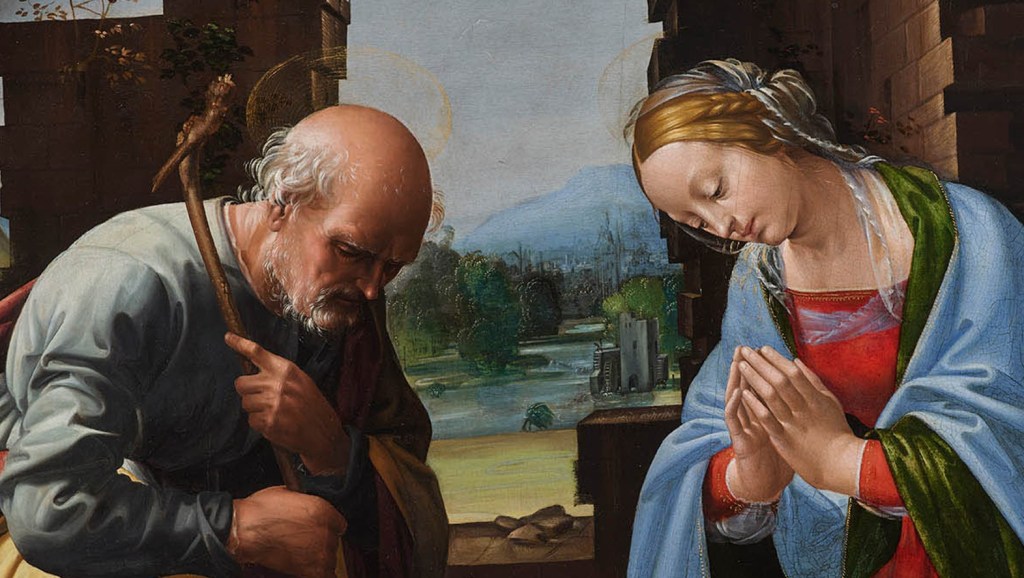 La Madonna, inginocchiata a destra, lo osserva con devozione a mani giunte. San Giuseppe è più defilato sulla destra, intento a reggere l’asinello. La disposizione dei personaggi crea una composizione simmetrica e armoniosa.
