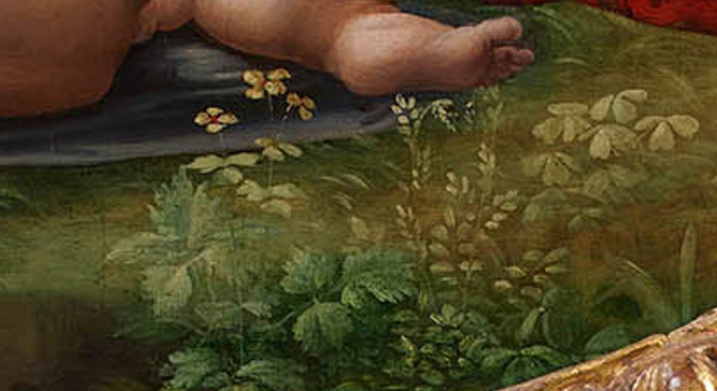 The vegetation is rendered with great care and detail, while the perspective of the background presents some inaccuracies, typical of the artist’s early period.
