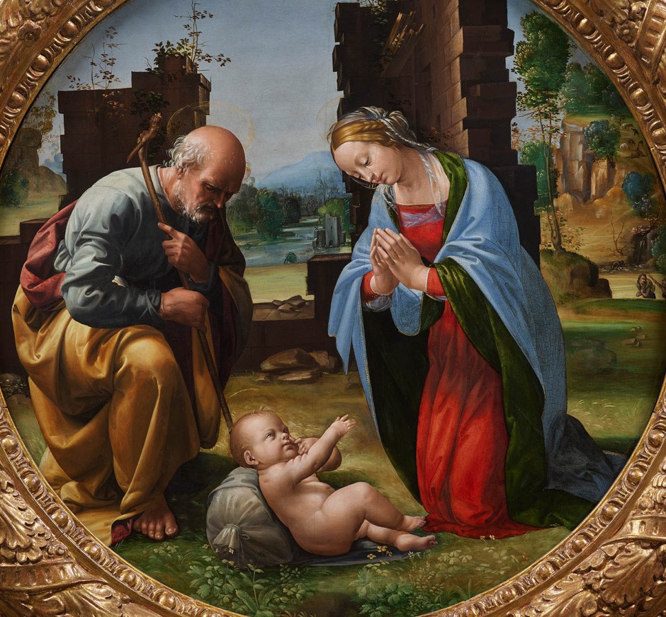 Fra Bartolomeo, al secolo Baccio della Porta, ha ambientato la Natività in un contesto bucolico ma con elementi di rovine che richiamano l’antica Roma, simboleggiando la fine del paganesimo e l’avvento della nuova era cristiana.