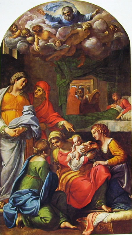 Saint Anne holds the newborn Madonna in her lap, surrounded by women busily pouring water, carrying away laundry with baskets on their heads, and offering gifts to the Baby.