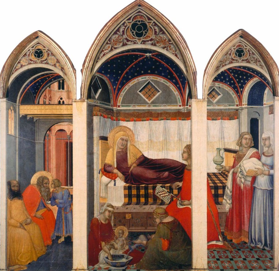 La Natività di Maria di Giotto fa parte del ciclo della Cappella degli Scrovegni a Padova. Sant’Anna, in età avanzata e con i capelli bianchi, siede nel letto mentre la levatrice le porge sua figlia Maria appena nata.