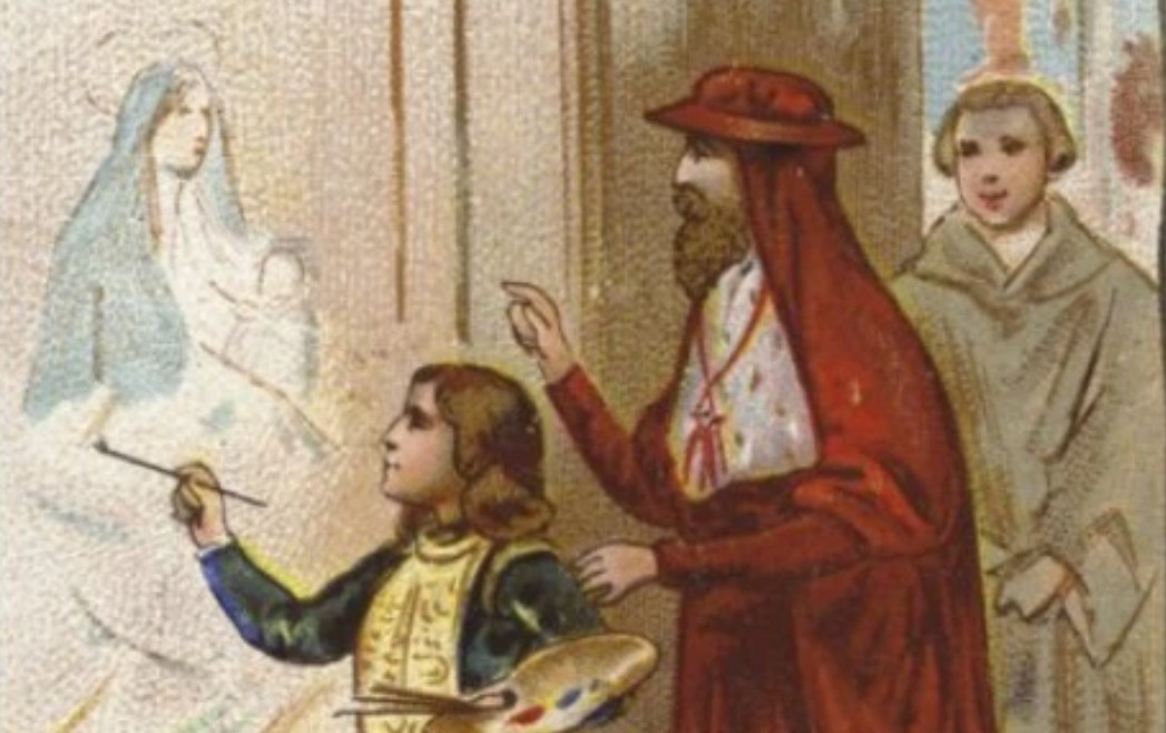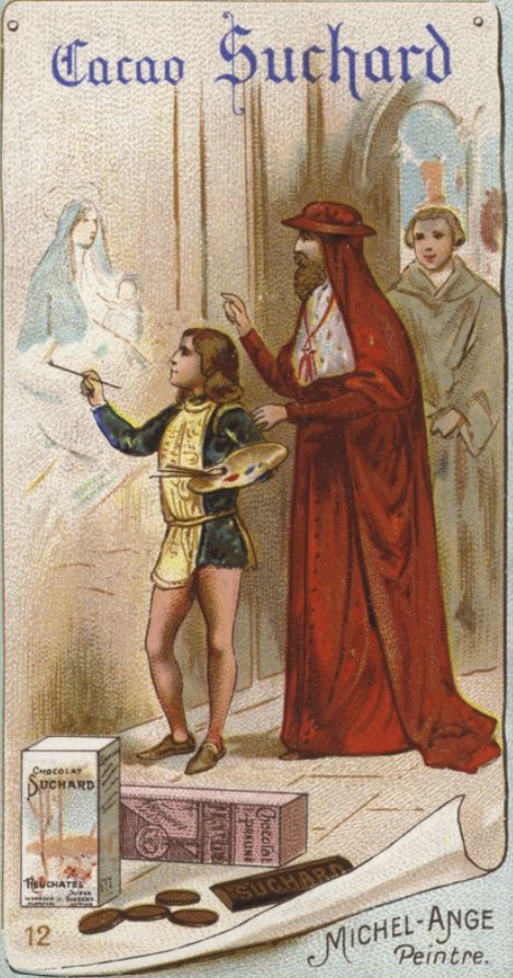 Nella figurina Suchard che vi propongo, la numero 12 della serie degli artisti, vedete un giovanissimo me alle prese con il dipinto di una Madonna che mai realizzai. Con indosso un farsetto più tipico della fine del Cinquecento che della fine del Quattrocento, sono intento a lavorare mentre alle mie spalle un cardinale e un frate mi osservano.