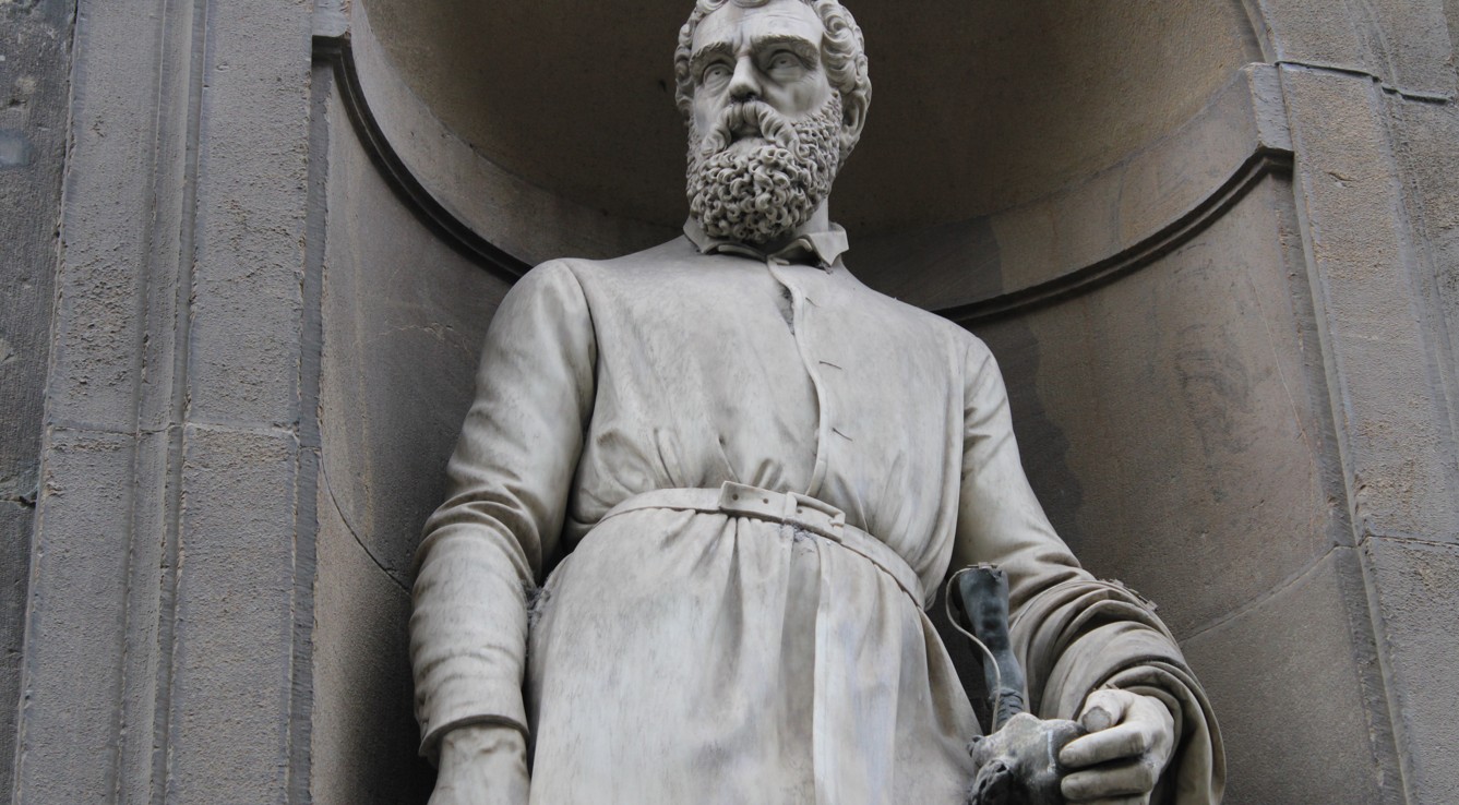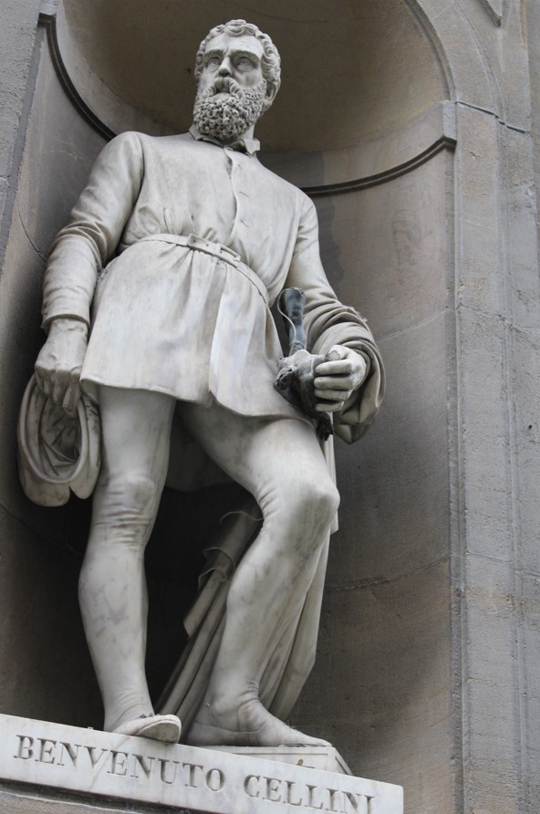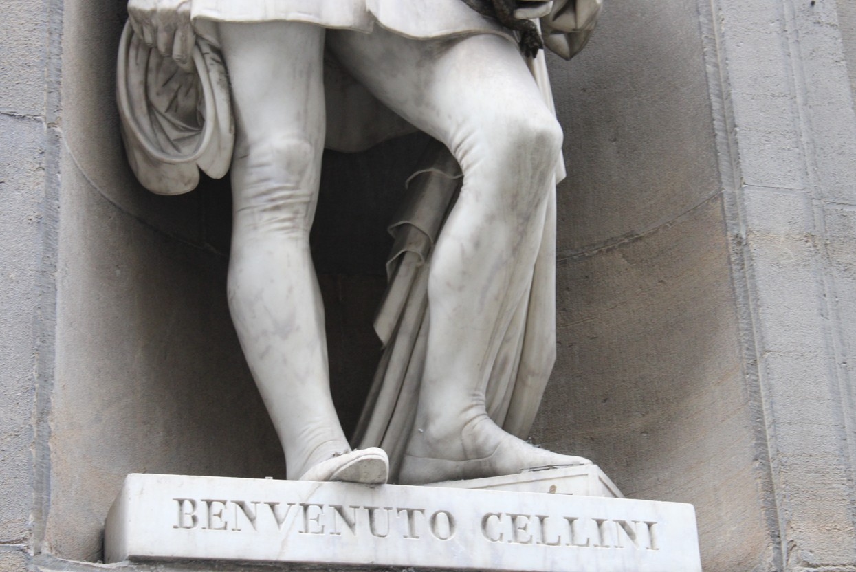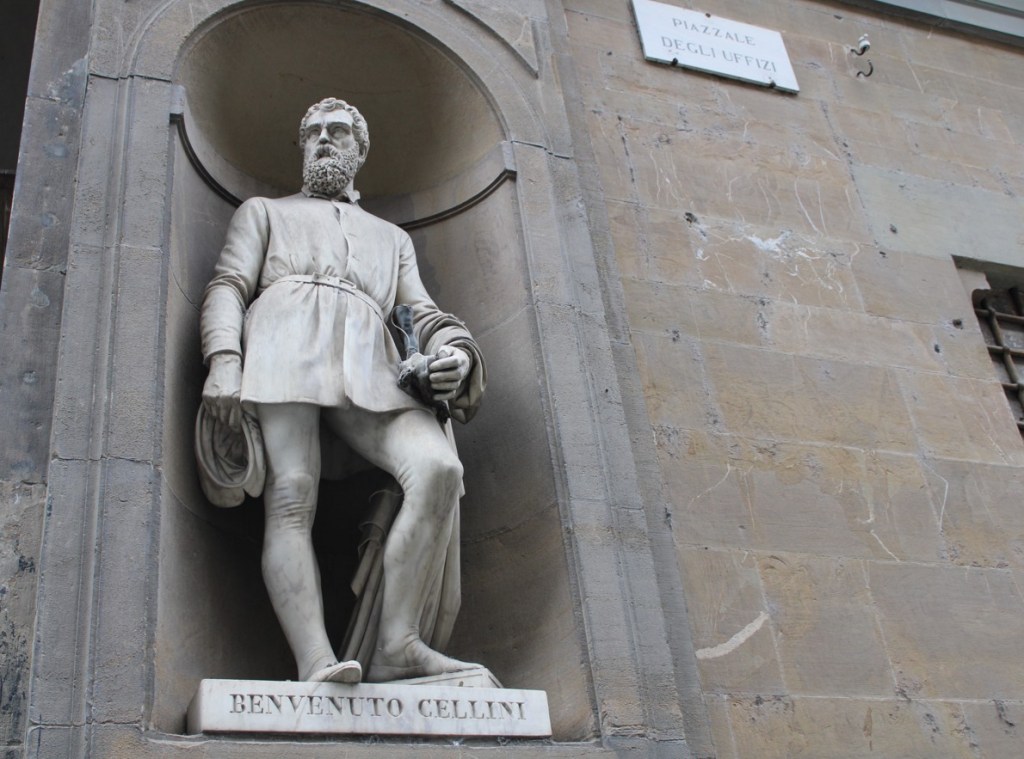 Tra le sculture degli uomini illustri collocate nella Loggia degli Uffizi, a cielo aperto, c’è anche quella di Benvenuto Cellini realizzata da Ulisse Cambi.