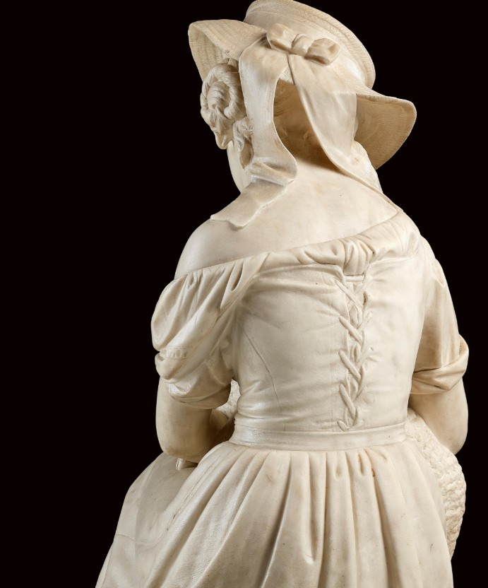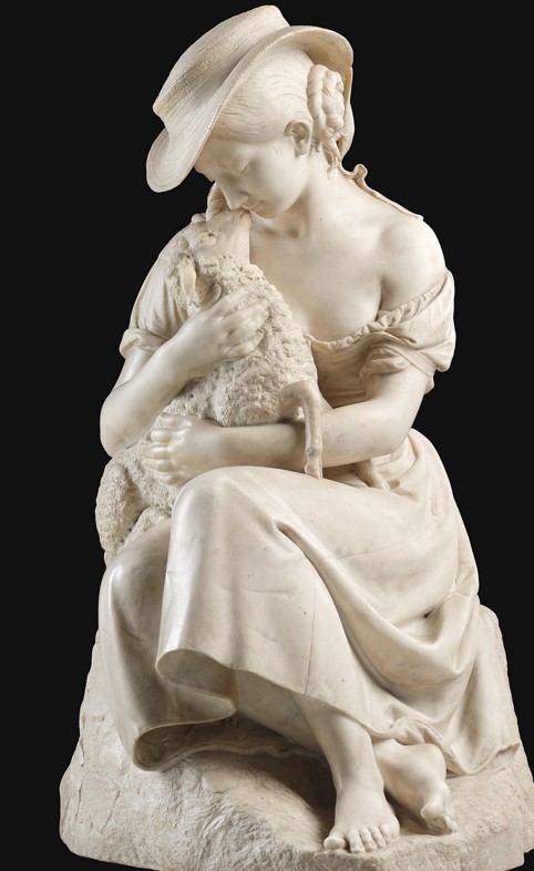 The sculpture of the day I want to talk about today is the Shepherdess Seated on a Rock with a Lamb in Her Lap, sculpted in white marble by Cesare Bazzoni in 1856.