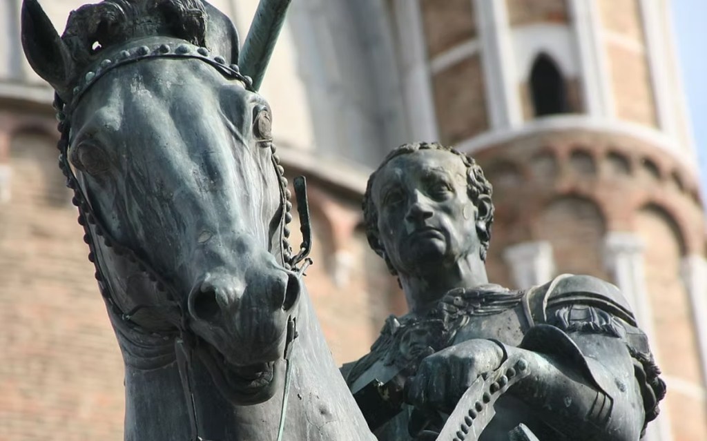 The Gattamelata depicted by Donatello was Erasmo da Narni, a famous 15th-century Italian condottiero in the service of the Republic of Venice. The bronze equestrian statue, commissioned by the condottiero’s widow, commemorates his role as captain general.