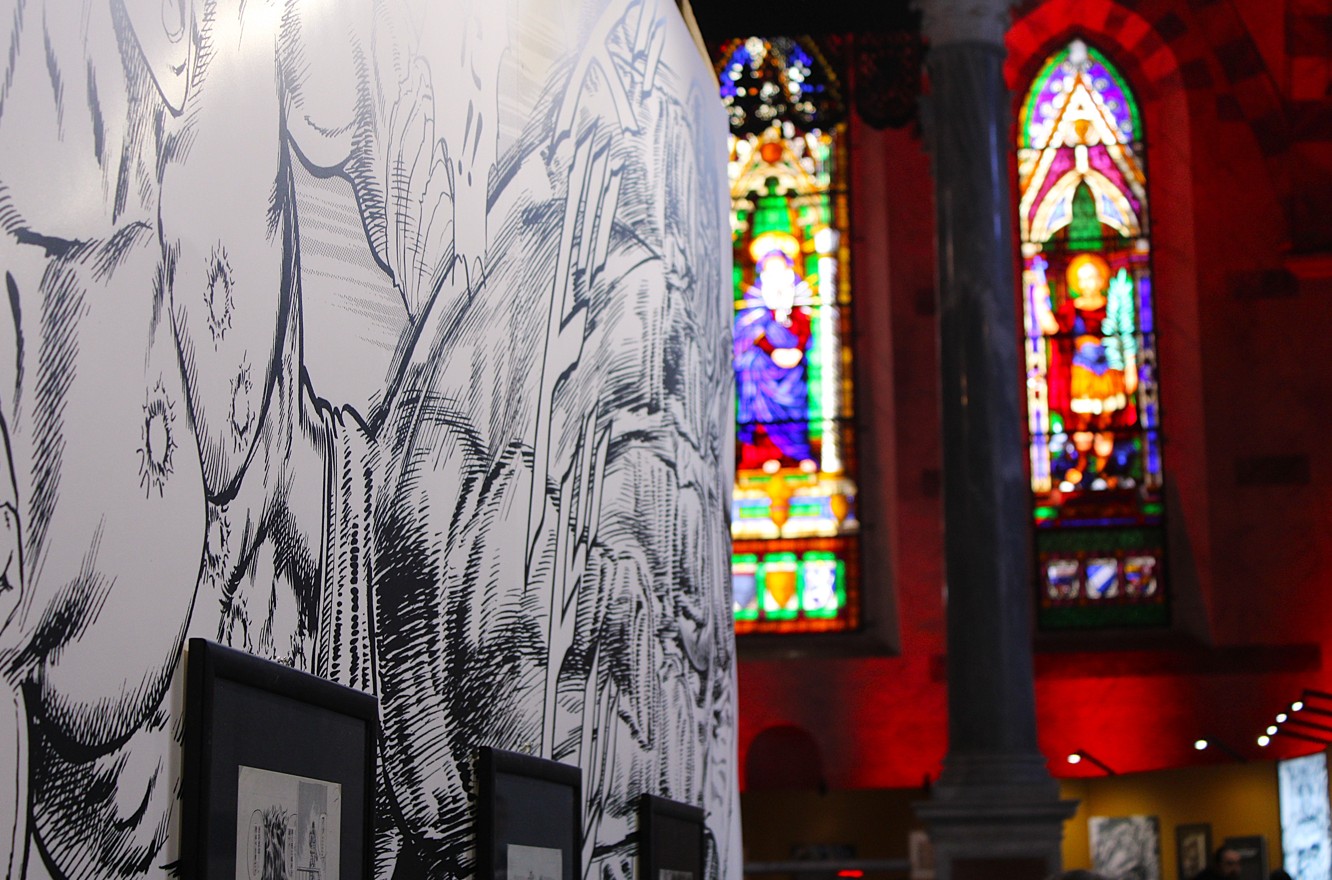 The exhibition is set up inside the Chiesa dei Servi, and I must say it’s quite strange for me to walk over the tombs beneath the watchful gaze of the large, blackened paintings, while images of Kenshiro unfold at eye level.