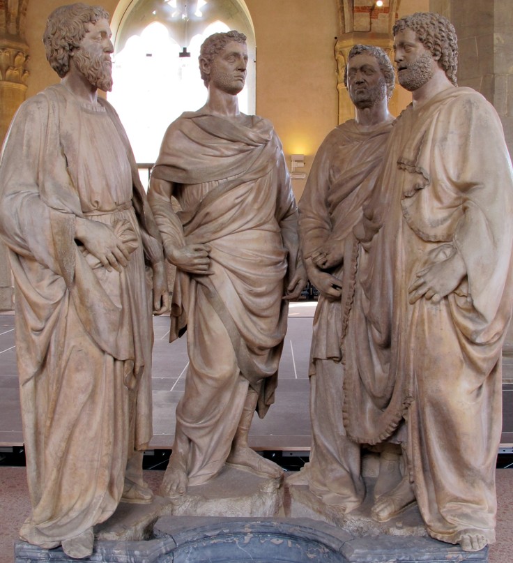 Nanni di Banco created a group of four figures that fill the entire available space and interact with each other. They wear ancient togas, and their faces seem directly inspired by Roman busts. Arranged in a semicircle, they almost seem to be discussing something they are doing.