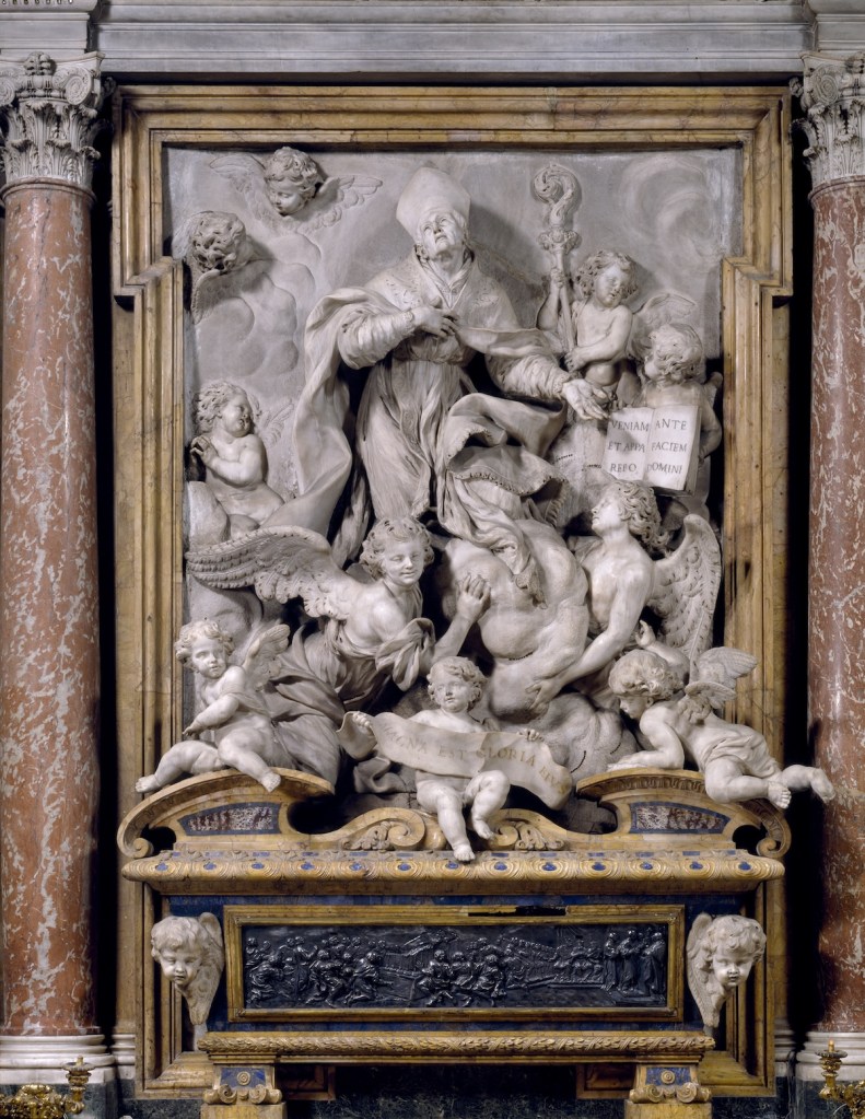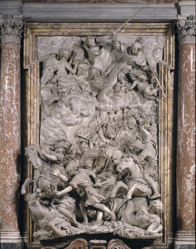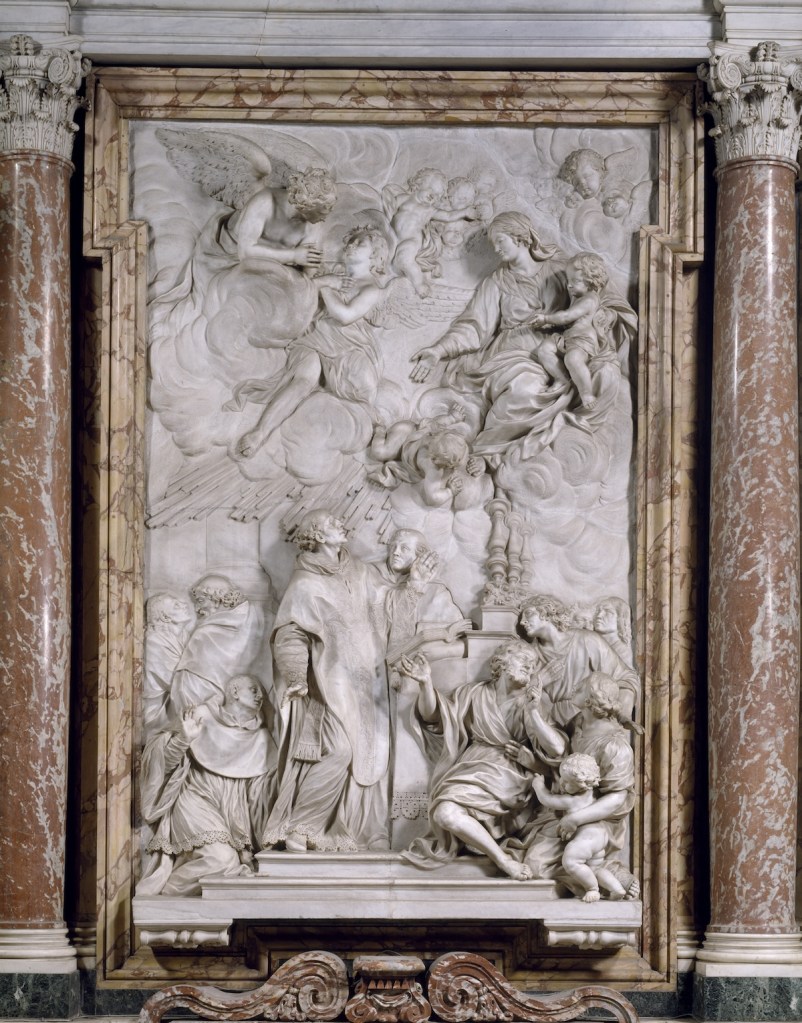 Upon his return from Rome, Foggini was commissioned to create both the catafalque to house the saint’s remains and the three marble reliefs depicting scenes from his life.