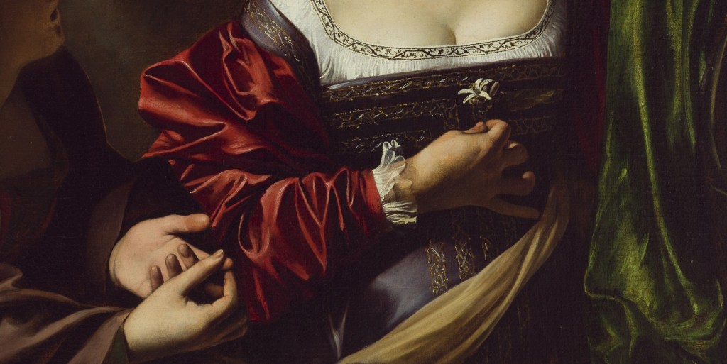 The light that bursts onto the scene from the left shapes the faces and especially the hands of the young women. It is as if Mary Magdalene’s repentance were prompted by the illumination, like a sort of inner awakening.