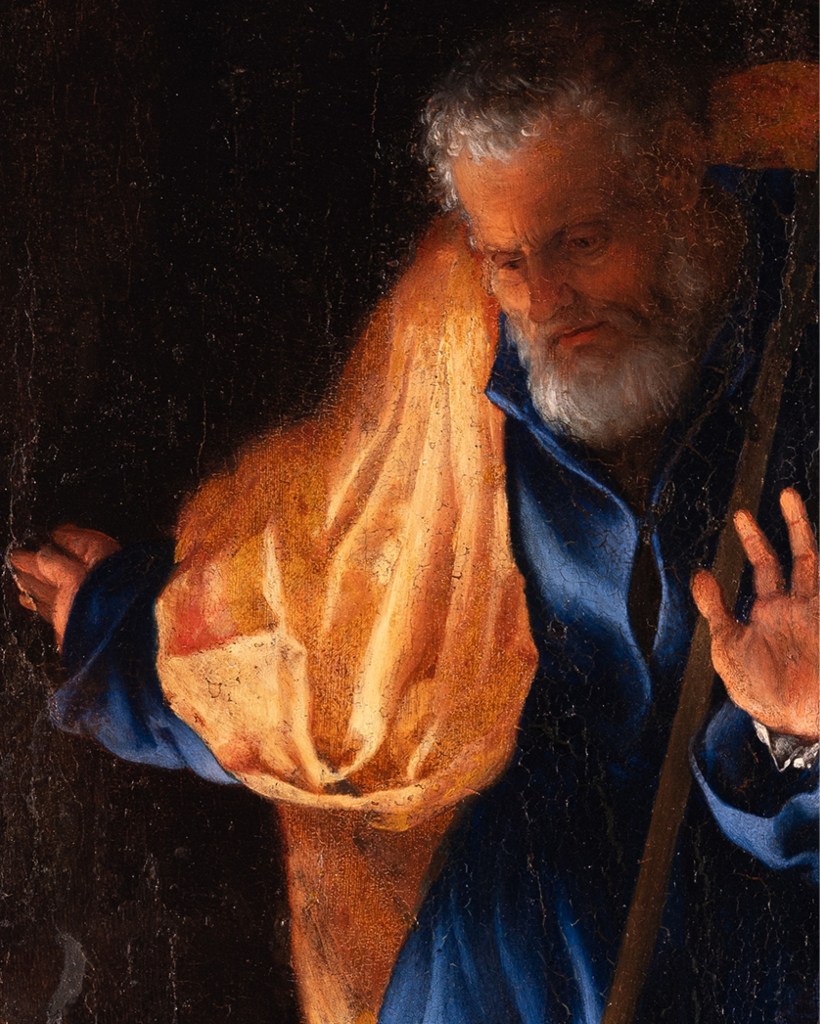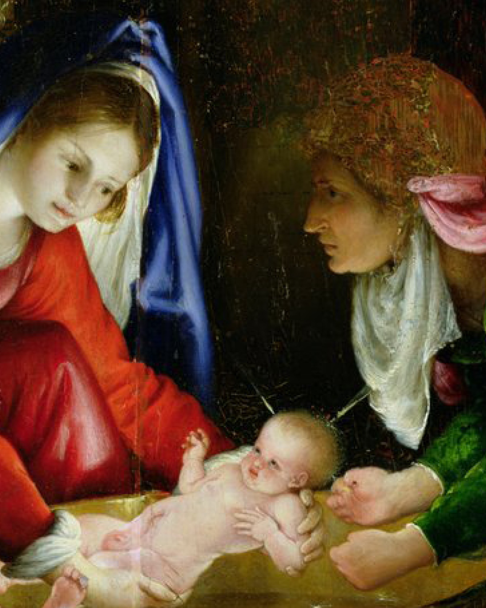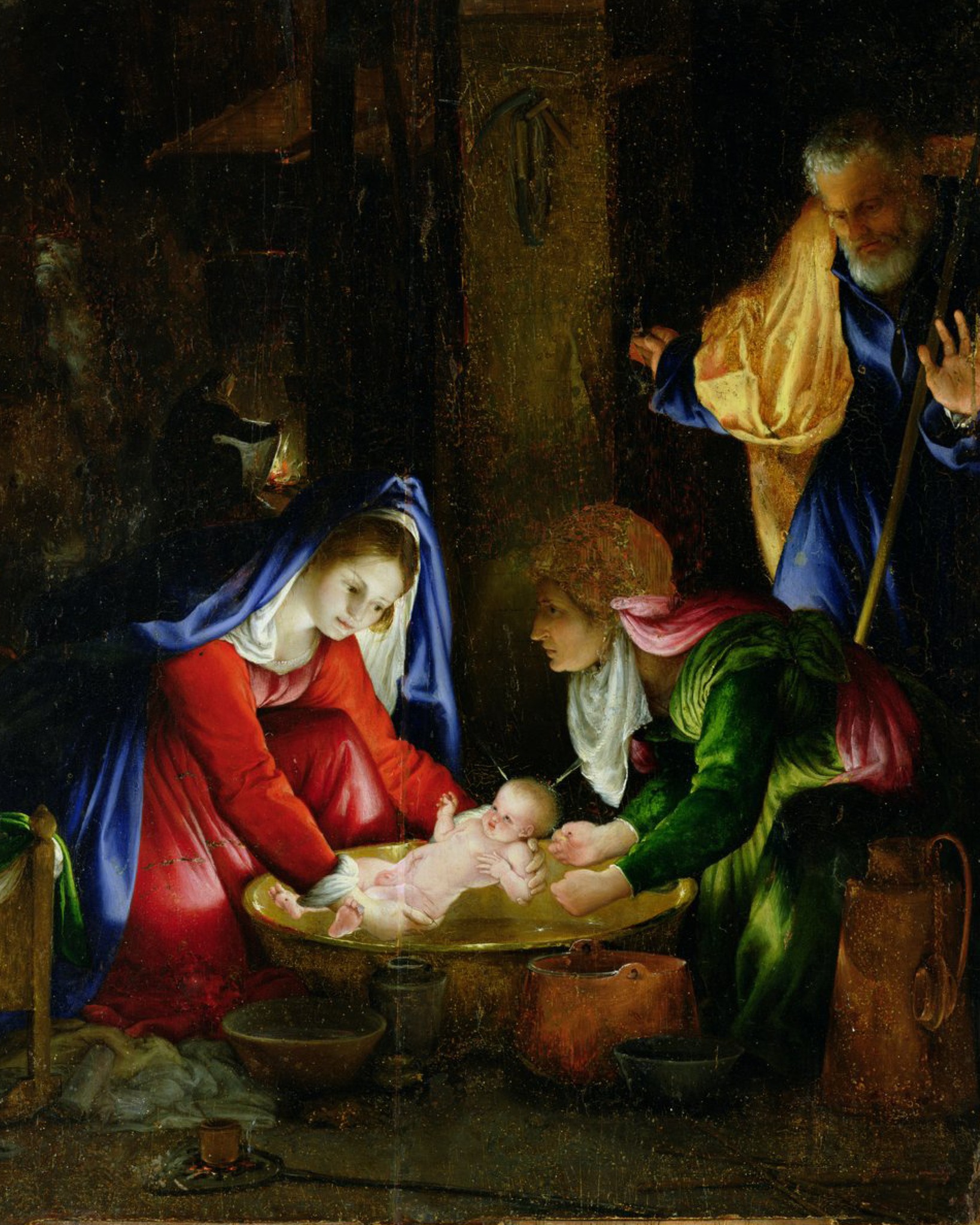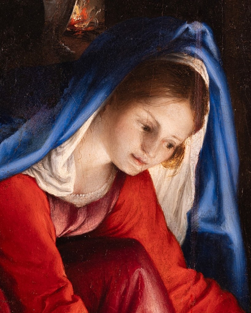 Lotto’s painting is an intimate family scene in which he experiments with the effects of light from two different sources. The Child radiates divine light, which is reflected on the faces and clothing of the characters moving across the scene, while in the background, the light from the fireplace allows another female figure to be glimpsed.