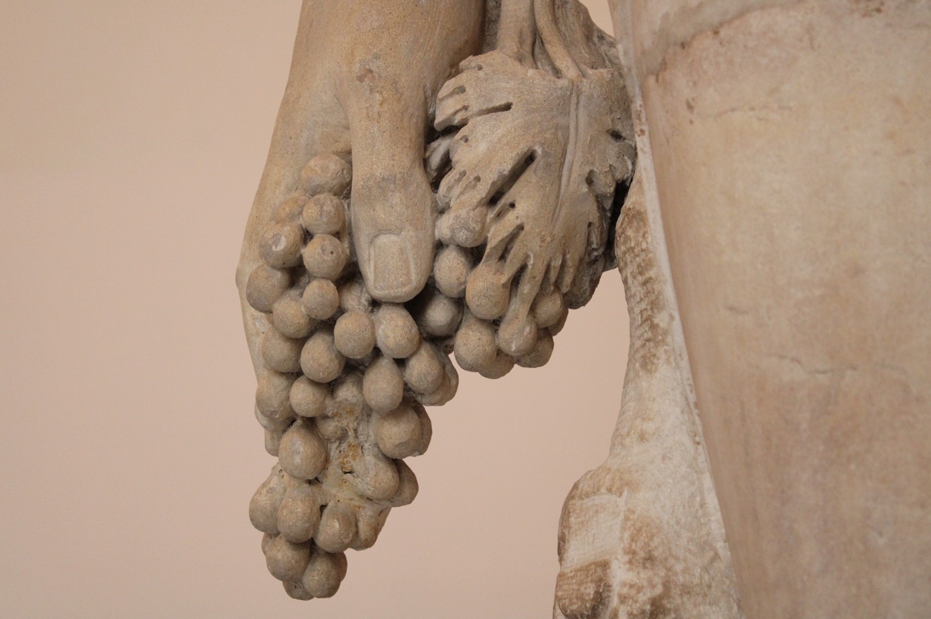 An ivy wreath encircles his head while a panther pelt wraps around his body. Bacchus raises the cup to the sky with a gesture that seems slow and measured. It is as if Antinous, who died prematurely in 130 AD, achieved immortality in the guise of the god of revelry and revelry.