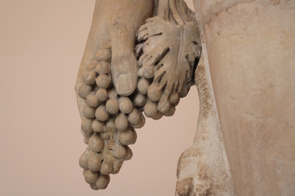 La corona d’edera gli cinge il capo mentre la pelle di pantera gli s’avvolge sul corpo. Bacco leva la coppa al cielo con un gesto che pare lento e misurato. E’ come se Antinoo, morto prematuramente nel 130 d.C., conquistasse l’immortalità nelle sembianze del dio dell’ebrezza e delle feste.