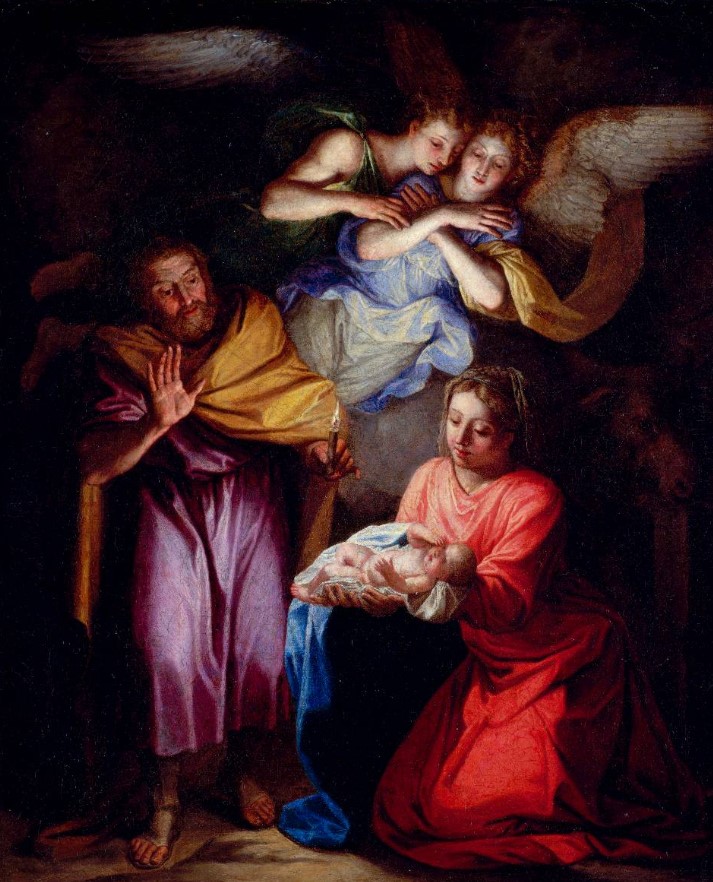 At the center of the scene is the Madonna, her face illuminated by the light emanating from the newborn baby Jesus. The Mother holds her Son in her arms while Saint Joseph, traditionally dressed in purple with an ochre cloak, contemplates them both.