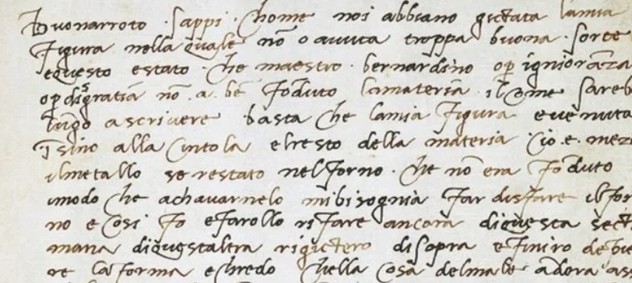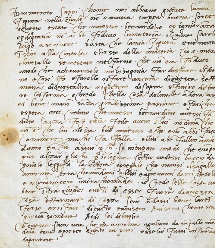 Buonarroto, know how we have cast my figure, in which I have not had much good fortune; And this is because Maestro Bernardino, either through ignorance or misfortune, did not cast the material well. It would take too long to explain how; it’s enough that my figure reached my waist; the rest of the material, that is, half the metal, remained in the furnace, which had not melted. So, to remove it, I would have to have the furnace torn down, and so I am doing, and will have it redone again this week. This week I will throw it back and finish filling the mold, and I believe that the thing, unfortunately, will go very well, but not without great passion, effort, and expense.