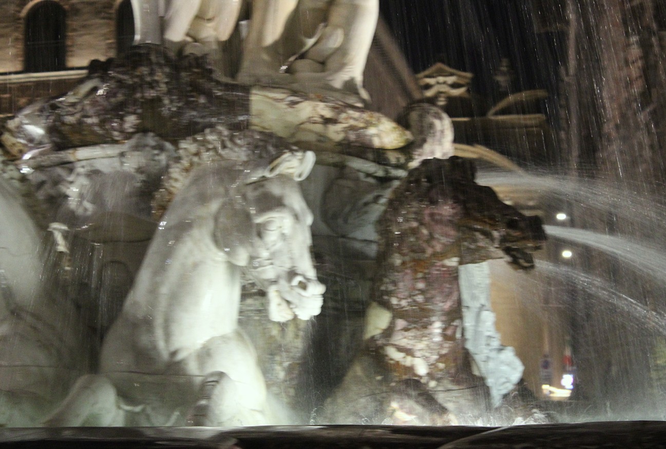 The figure of Neptune stands on a pedestal decorated with the figures of Scylla and Charybdis, at the center of an octagonal basin animated by the four horses of the chariot. At his feet, three Tritons play on tibias from which water gushes.