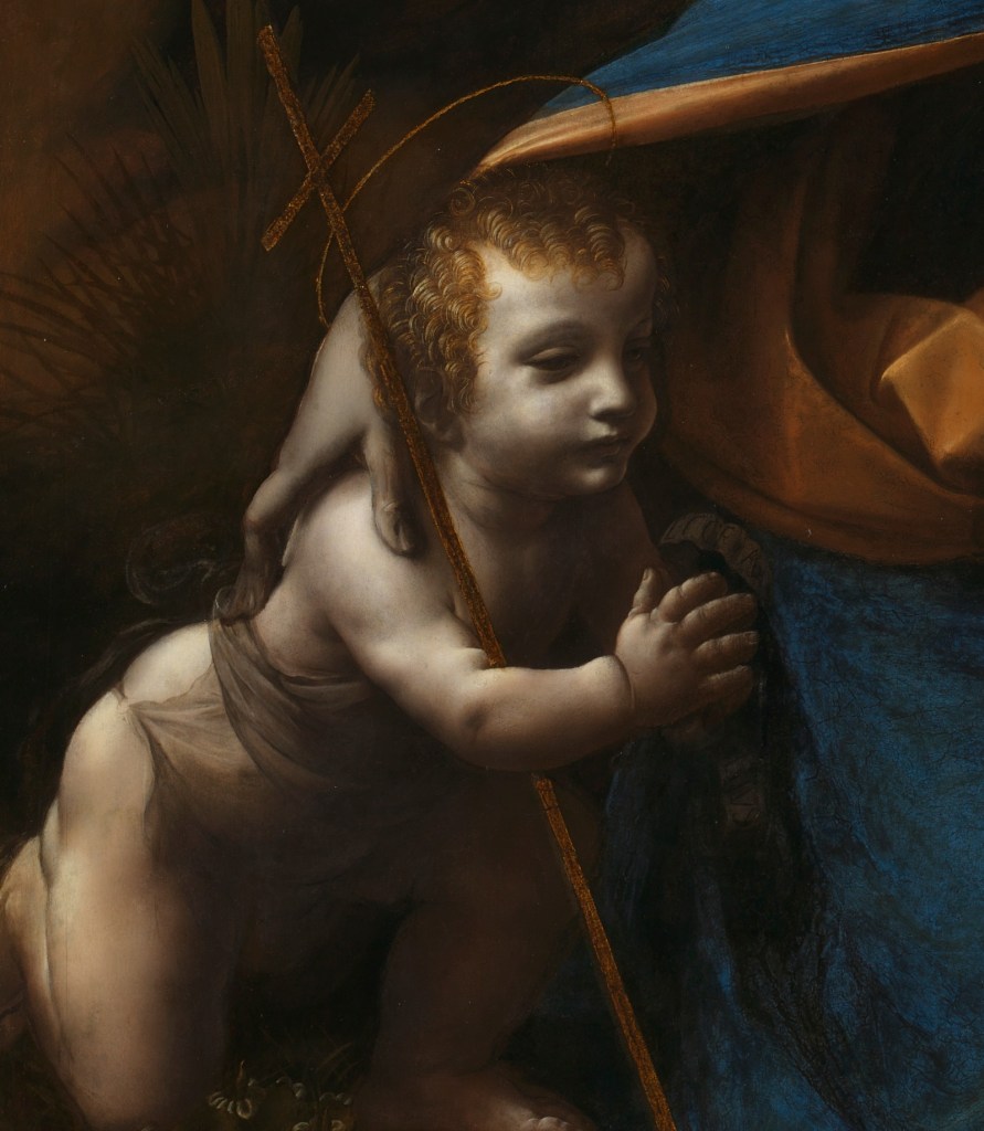 According to recent studies, part of the rocky landscape and vegetation may be the work of Marco d’Oggiono. Archival documents and diagnostic tests suggest a direct collaboration between Leonardo and Ambrogio de Predis, further supported by the Confraternity’s request of April 27, 1506, to complete the work begun by the master and continued by his student.