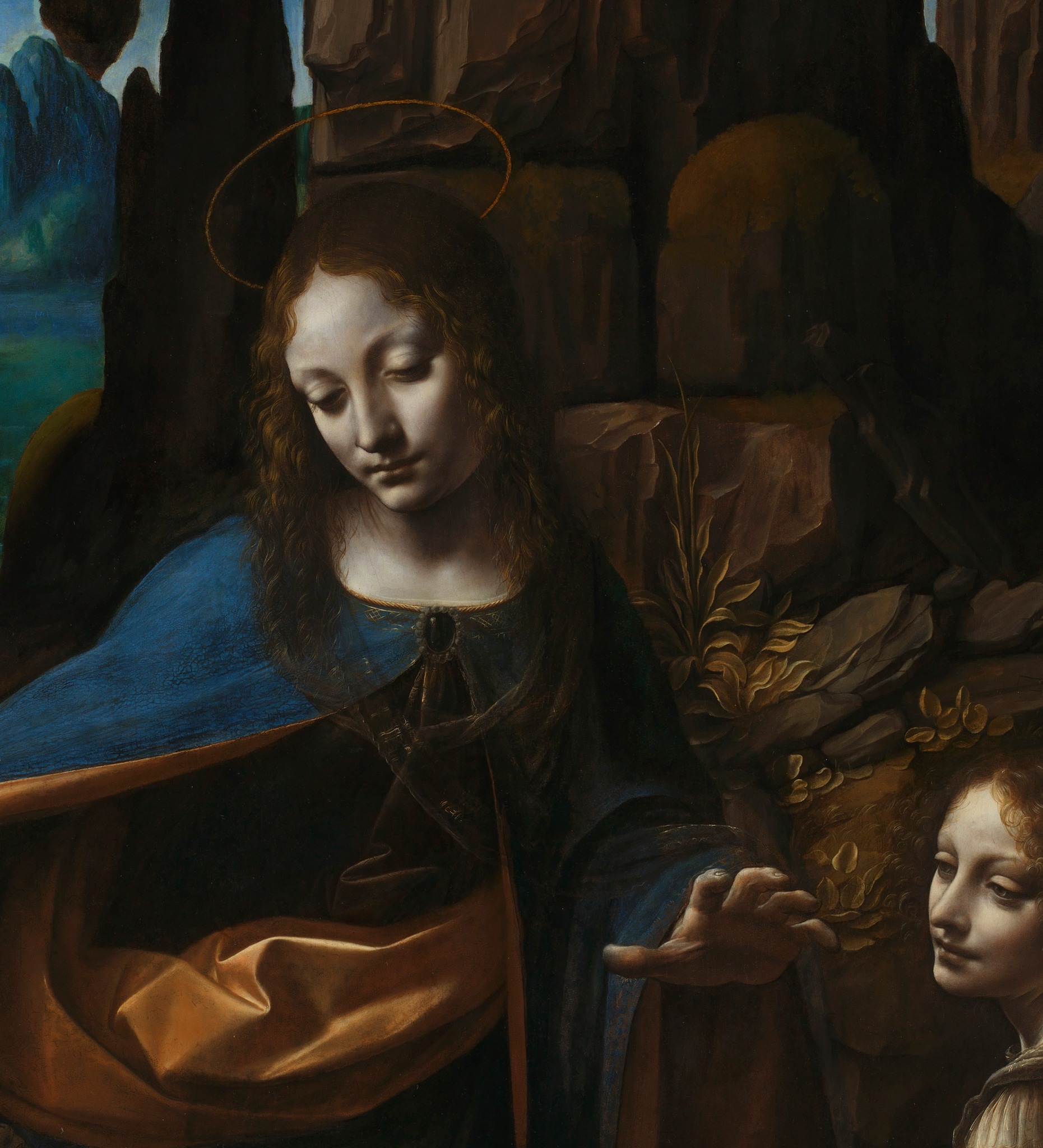 According to recent studies, part of the rocky landscape and vegetation may be the work of Marco d’Oggiono. Archival documents and diagnostic tests suggest a direct collaboration between Leonardo and Ambrogio de Predis, further supported by the Confraternity’s request of April 27, 1506, to complete the work begun by the master and continued by his student.