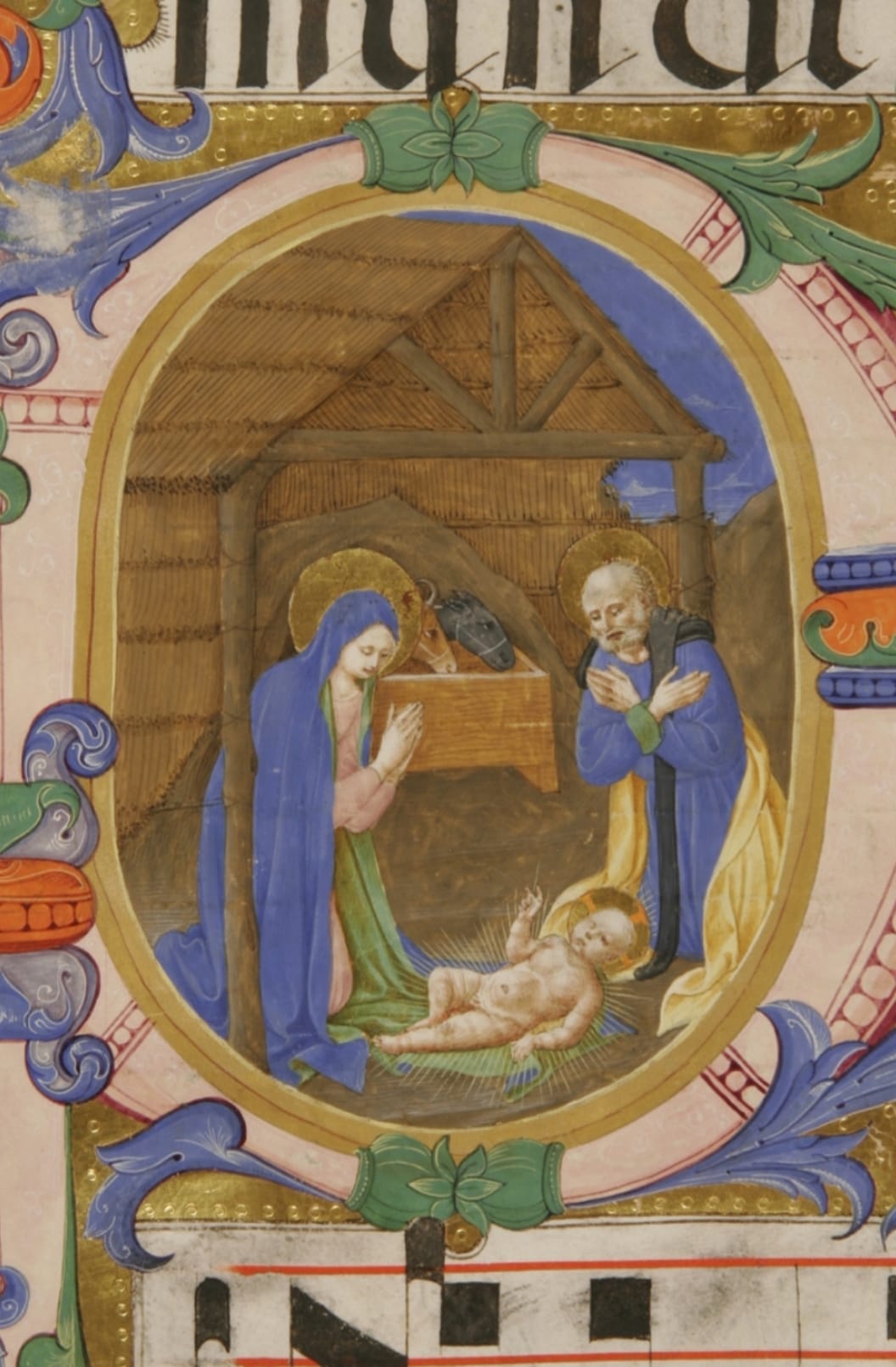 Le scene della Natività compaiono spesso all’interno dell’iniziale P di Puer natus est, il canto che apre la celebrazione natalizia. In queste miniature ritroviamo i personaggi tradizionali del presepe: Gesù Bambino, Maria, Giuseppe, il bue e l’asino, inseriti in composizioni semplici ma ricche di simbolismo.