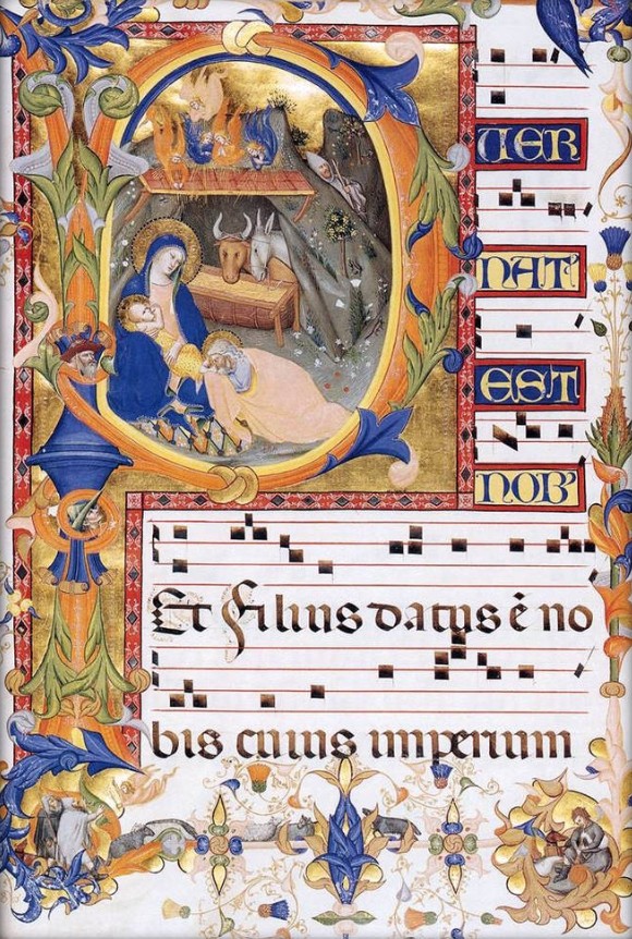 The illuminated manuscript with the score of the Gregorian chant “Puer natus est nobis” by Don Silvestro dei Gherarducci at the end of the 14th century, decorated in tempera and gold on parchment, is truly remarkable.