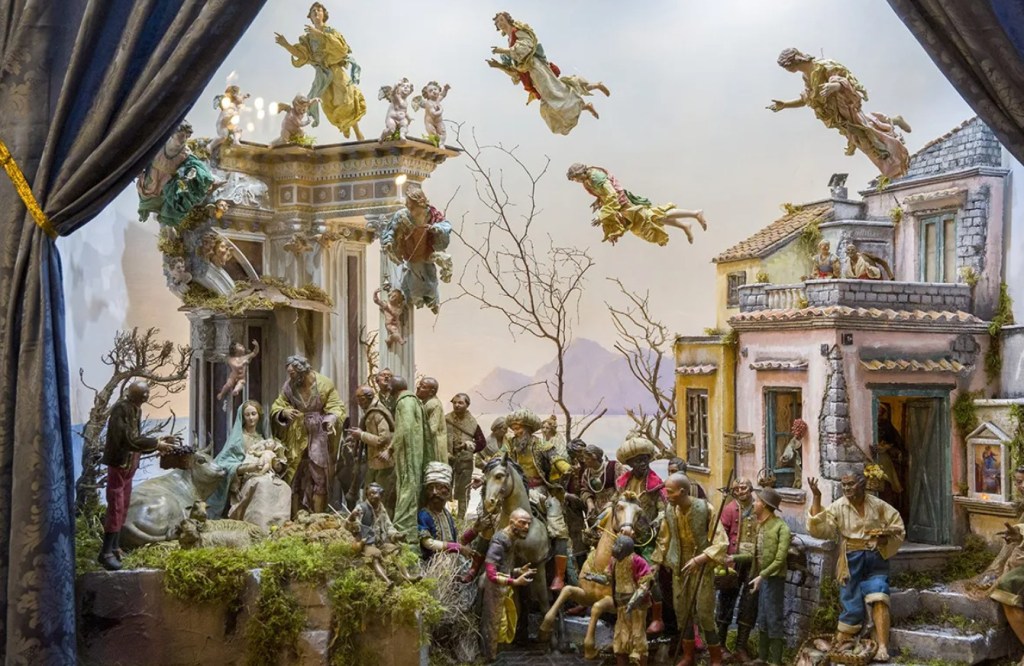 The Neapolitan nativity scene, exhibited in Sorrento, is one of the most complex and narrative forms of the Nativity. Here, the sacred scene intertwines with the daily life of the eighteenth century, creating a theatrical microcosm of characters, symbols, and meticulous details.