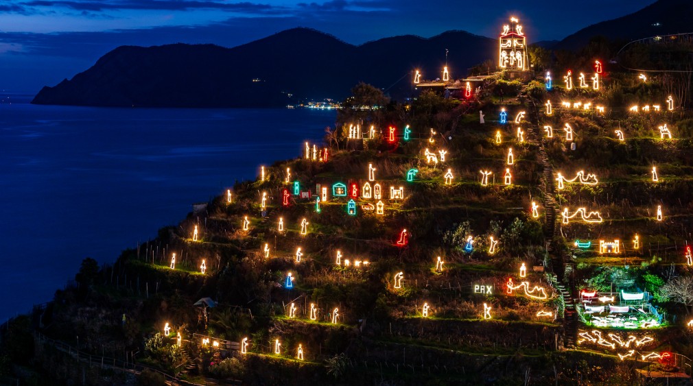 Il presepe di Manarola è una delle interpretazioni più contemporanee della Natività. Le figure non sono scolpite nella materia, ma disegnate dalla luce, trasformando la collina in una grande installazione di land art.