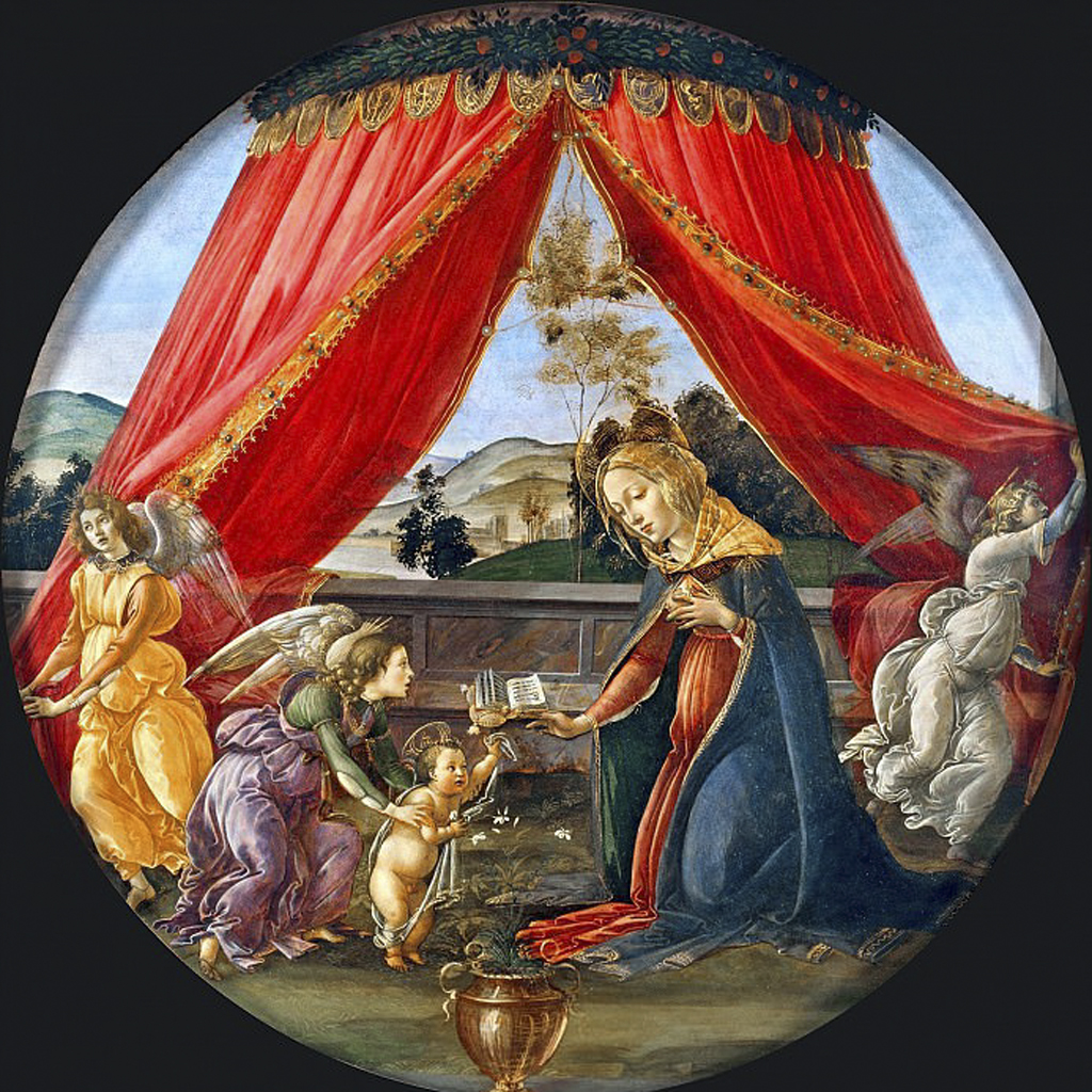 The Madonna of the Pavilion is a tondo, a much-loved form in fifteenth-century Florence and often intended for domestic devotion. The circular format encourages a continuous and enveloping reading of the image, inviting the viewer to linger in contemplation.