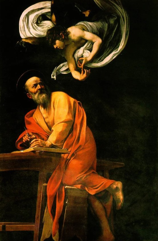 Nel pieno del Barocco, Caravaggio offre una visione sorprendentemente concreta dell’angelo. In San Matteo e l’angelo, l’essere celeste sembra scendere fisicamente accanto all’evangelista, guidandogli la mano con un gesto semplice e diretto.