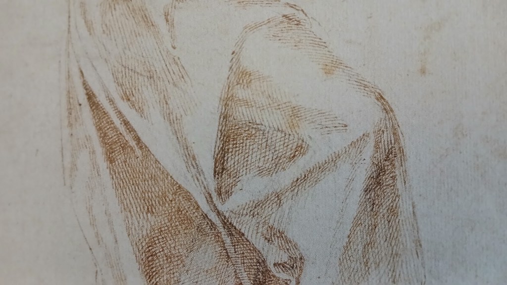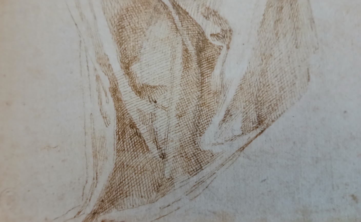 In un secondo momento tornai sul disegno, avvolgendo il bacino in un ampio panneggio tracciato a penna e inchiostro bruno. Il segno leggero della matita resta comunque visibile nella testa, nel busto e nelle braccia, delineando un nudo verosimilmente femminile, mentre le gambe, l’una sollevata e appoggiata a un basamento, l’altra saldamente a terra, emergono solo parzialmente sotto il successivo tratteggio.