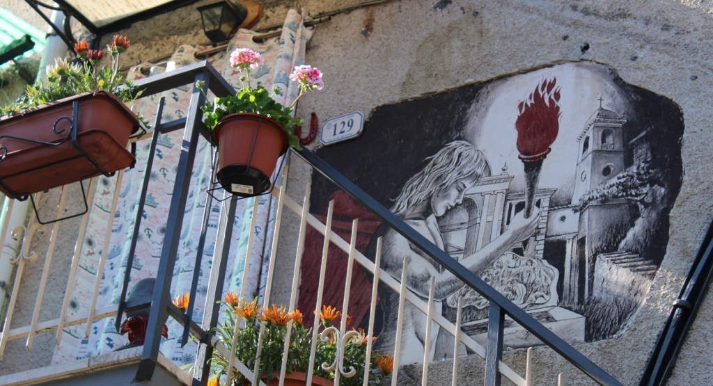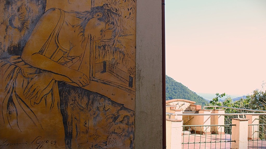 Some sgraffiti are immediately apparent, others are discovered only by looking up or retracing one’s steps. The village invites observation, silence, and a direct connection with art that arises from the context and could not exist elsewhere.