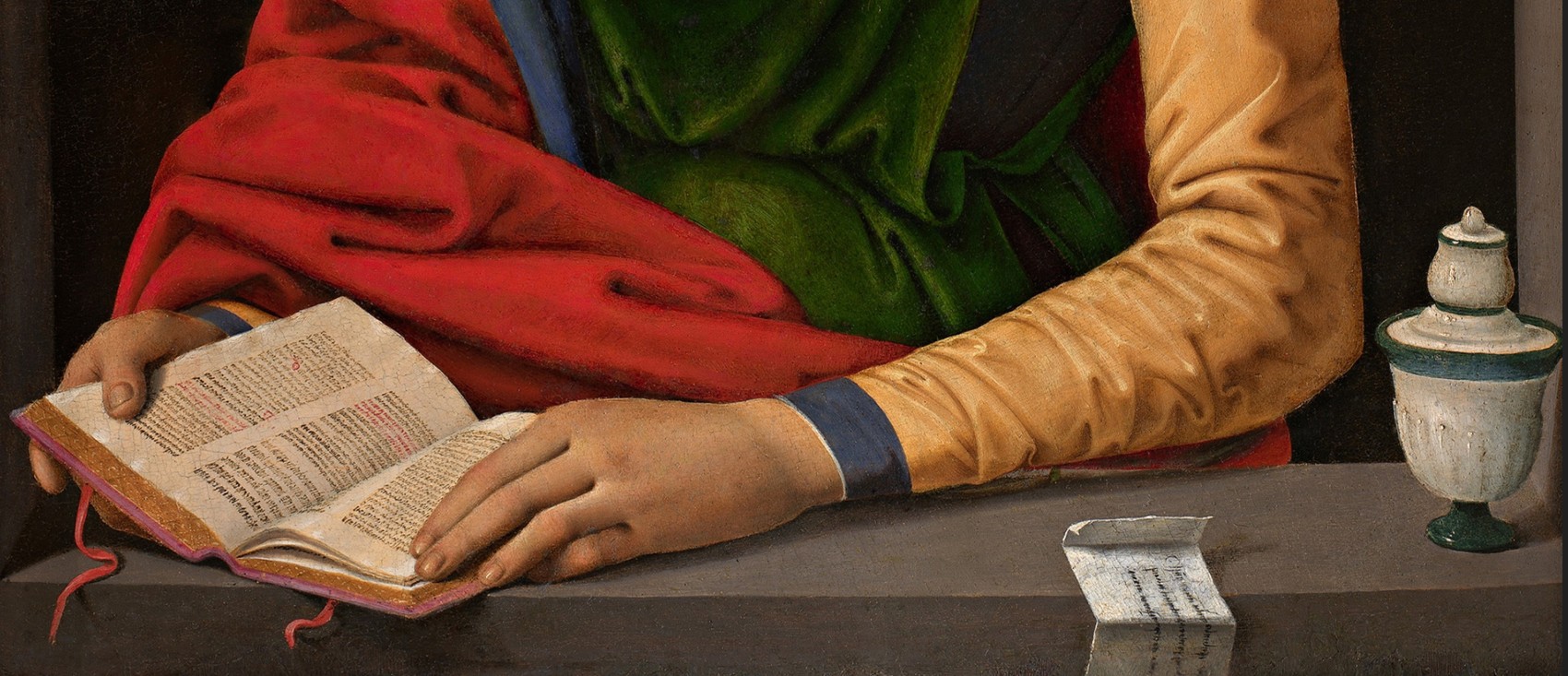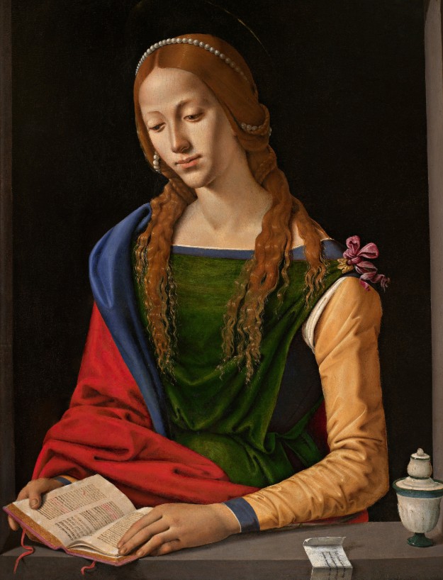 The refined dress, the collected pose, and the open book the Magdalene holds in her hands recall 15th-century Florentine portraiture.