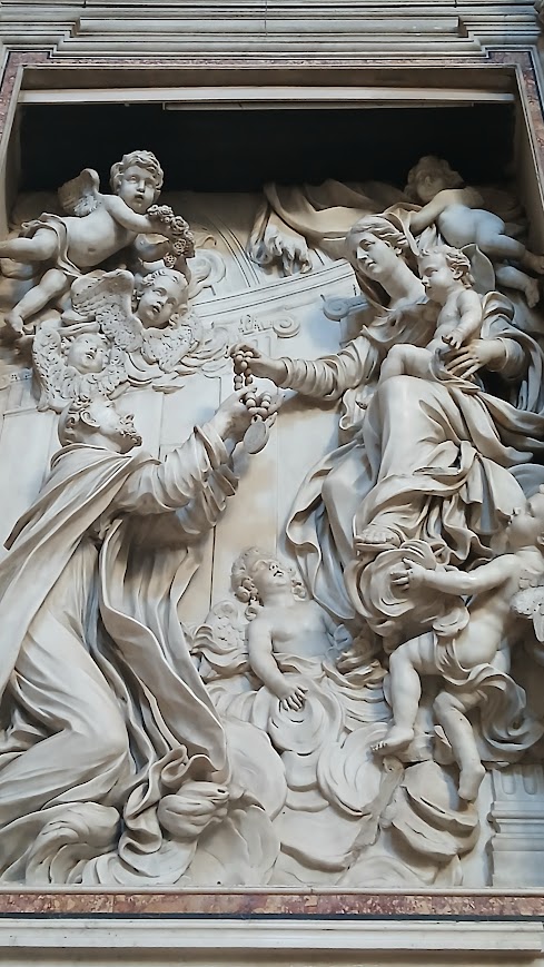 This context includes the marble relief of the Virgin Giving the Rosary to Saint Dominic, created in 1697 by the Carrara sculptors Andrea and Tommaso Lazzoni, one of the most significant testimonies to the spread of the cult of the rosary through art.